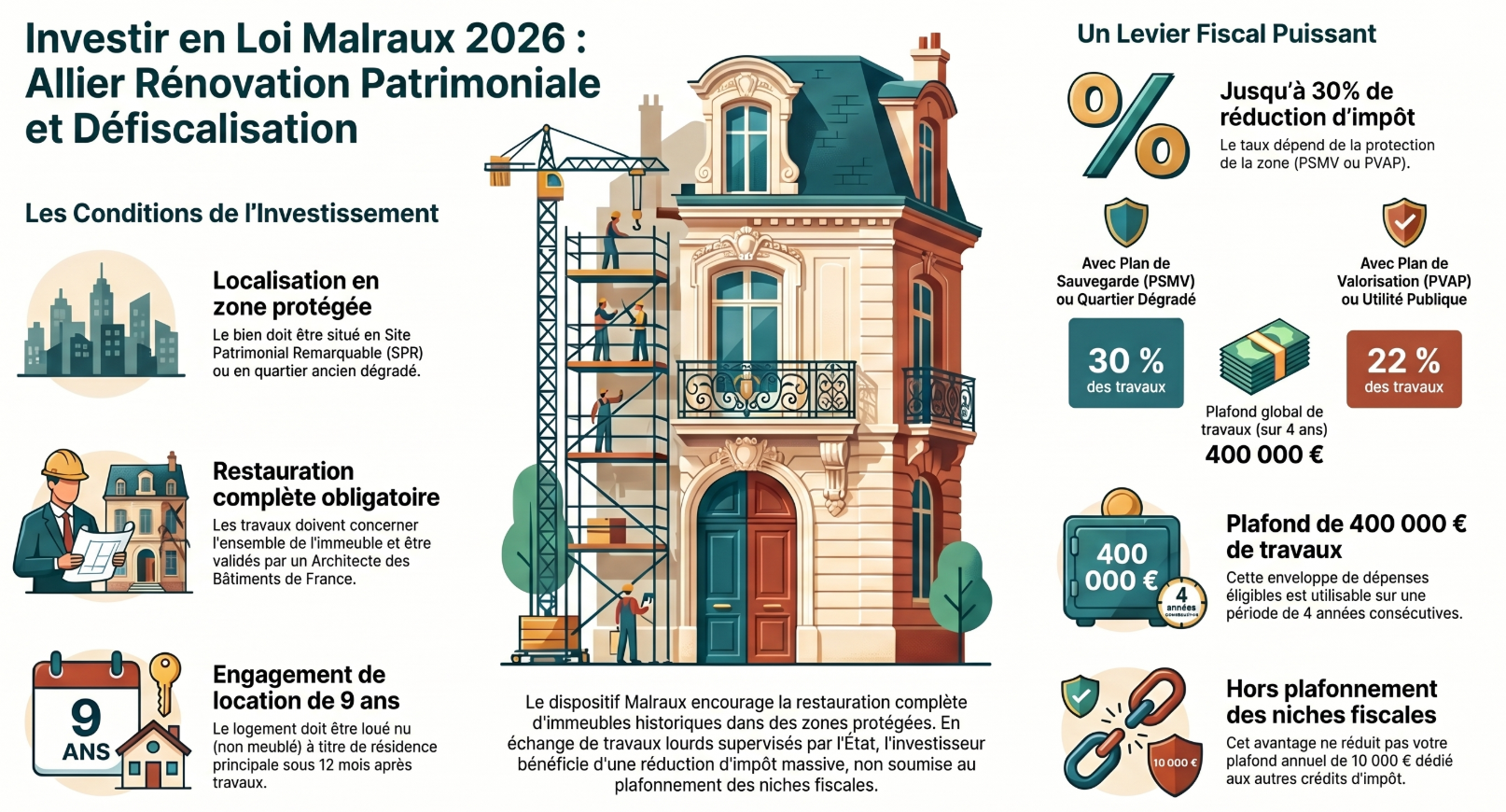 La nuance : Le Malraux est un outil de précision. Il devient vraiment intéressant à partir d'une tranche marginale d'imposition (TMI) de 30 %, et il est redoutable à 41 % ou 45 %. En dessous de 30 %, votre client risque de "perdre" de l'avantage fiscal, car le surplus n'est reportable que sur 3 ans.