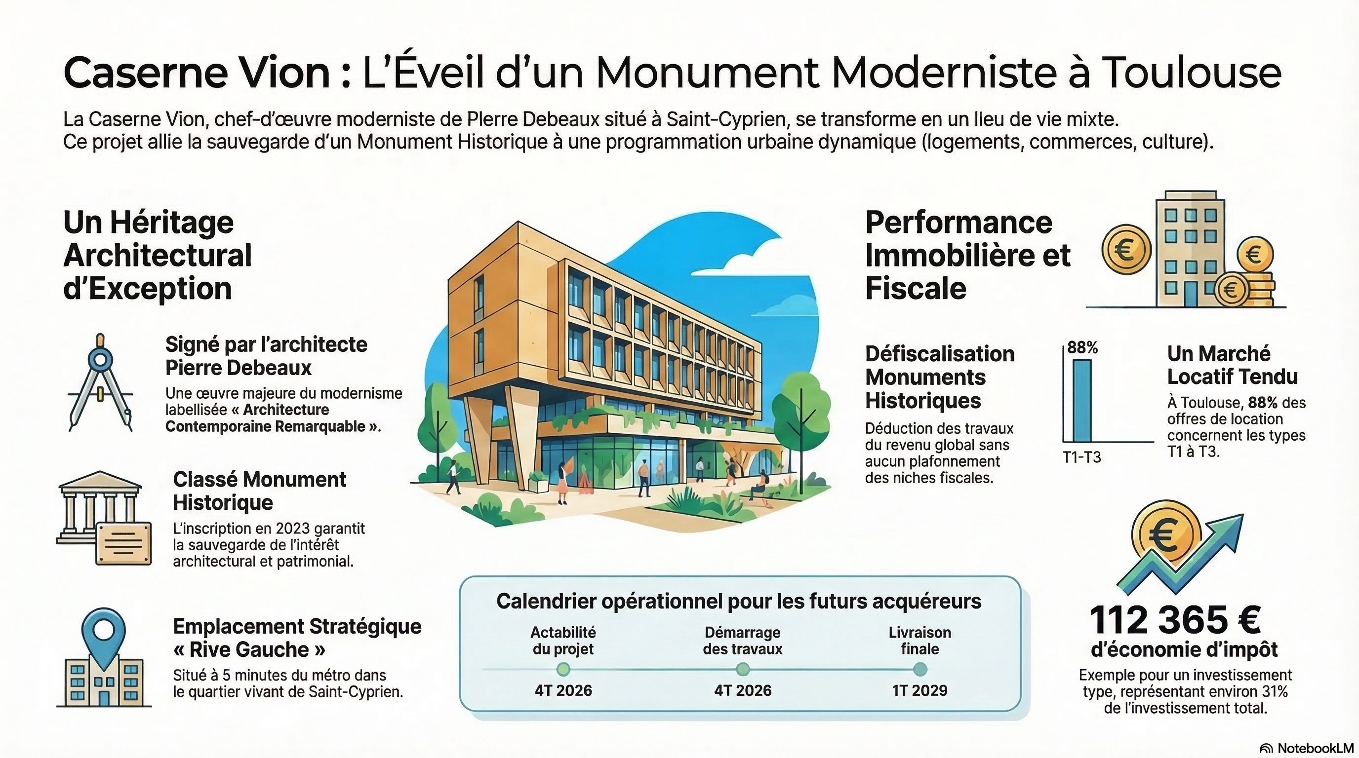 Le 14 septembre 2023, la Caserne Jacques Vion est inscrite au titre des Monuments Historiques. Un an plus tard, la Ville de Toulouse cède l'ensemble à Sporting Promotion et Vinci Immobilier pour 14 millions d'euros. Commercialisation lancée en avril 2026. Pour un investisseur à TMI élevée à la recherche d'un programme patrimonial différenciant, la Caserne Vion concentre ce qui rend un dossier crédible : un bâtiment rare, des opérateurs solides, un calendrier maîtrisé.